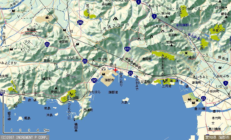 | 東名高速道路 音羽蒲郡ICよりオレンジロード(有料)を南下、国道247号線を西へ、途中南下(290Km/約4時間) |